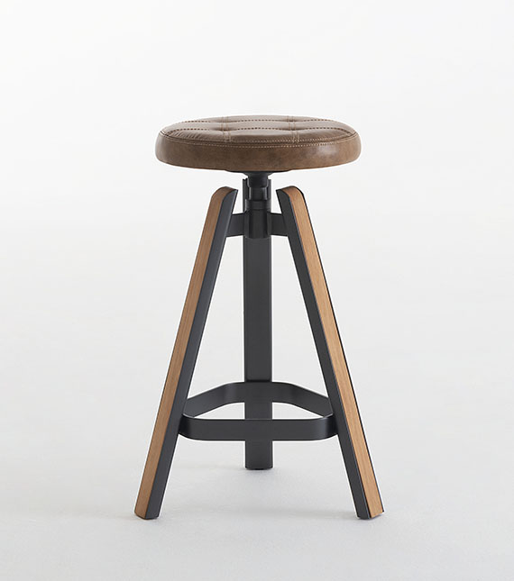 A Banqueta Argo é composta por três pés de metal em perfil “U”, assento com sistema de giro. O detalhe fica por conta da madeira inserida dentro do metal.