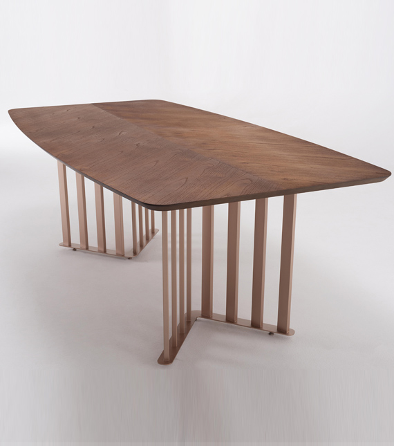 O formato em “v” ou girando-se transforma-se em “>” (maior que) é o elemento chave que guia toda a criação. A analogia com as nervuras da folha, combinadas com um desenho de tampo mais arredondado e uma repetição de elementos nos pés, traz uma linguagem mais fluída e orgânica para a composição.