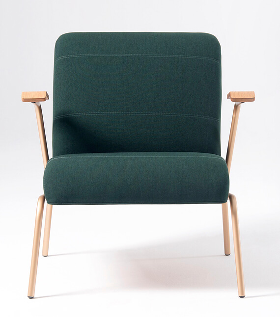 Inspirada no piers californianos que avançam encima do mar pacífico. A Poltrona Pier traz no seu design a leveza e resistência da estrutura em metal pintado, o conforto e volume das dunas de areia no assento, completado com o acabamento laminado de madeira na parte posterior da concha.