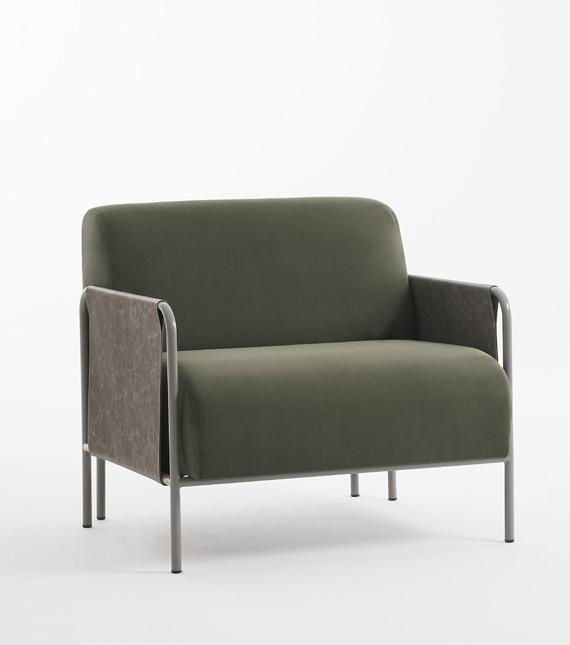 Versão solta da Poltrona Versátile com dois braços laterais. A aparência flutuante e a mistura de materiais como aço pintado, recouro e tecido combinam com qualquer ambiente. O assento volumoso torna a Versátile uma boa experiência de bem-estar.