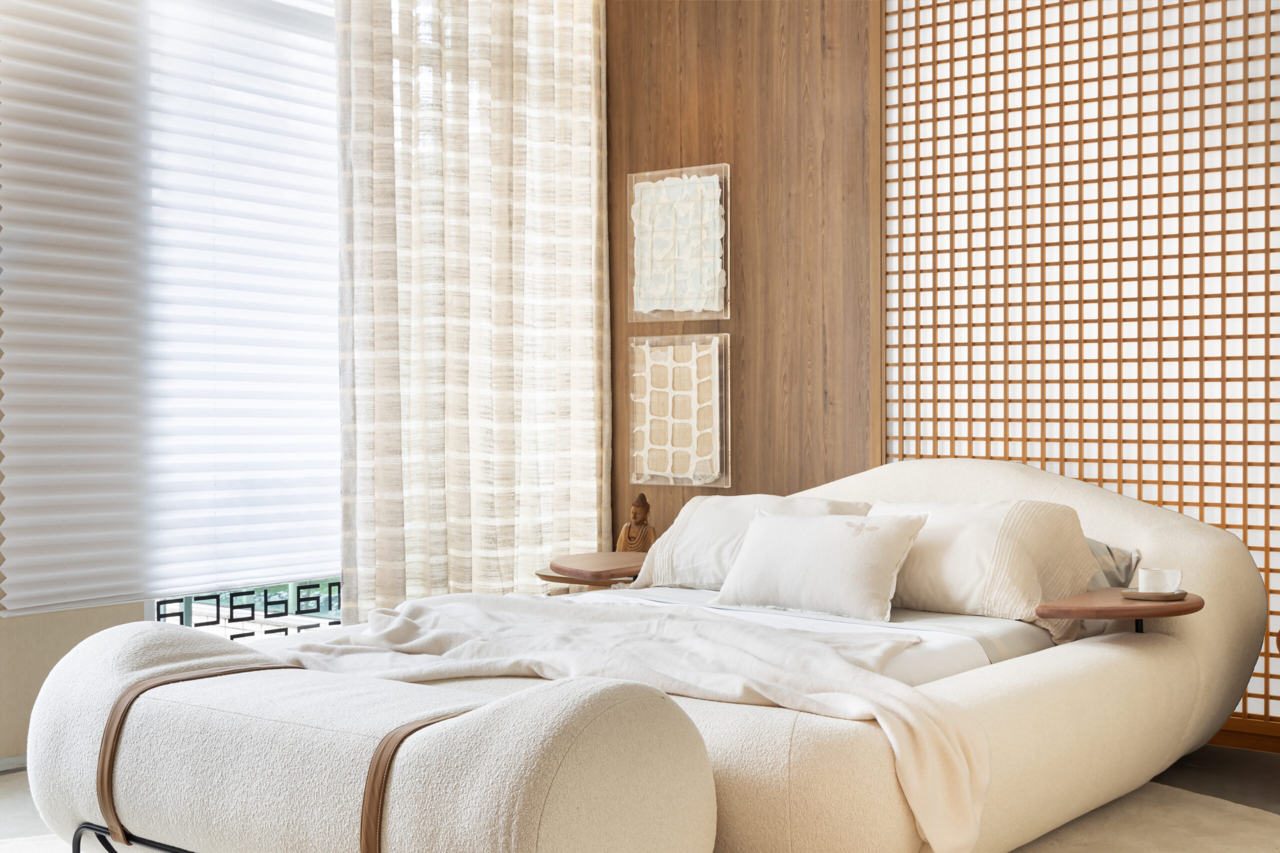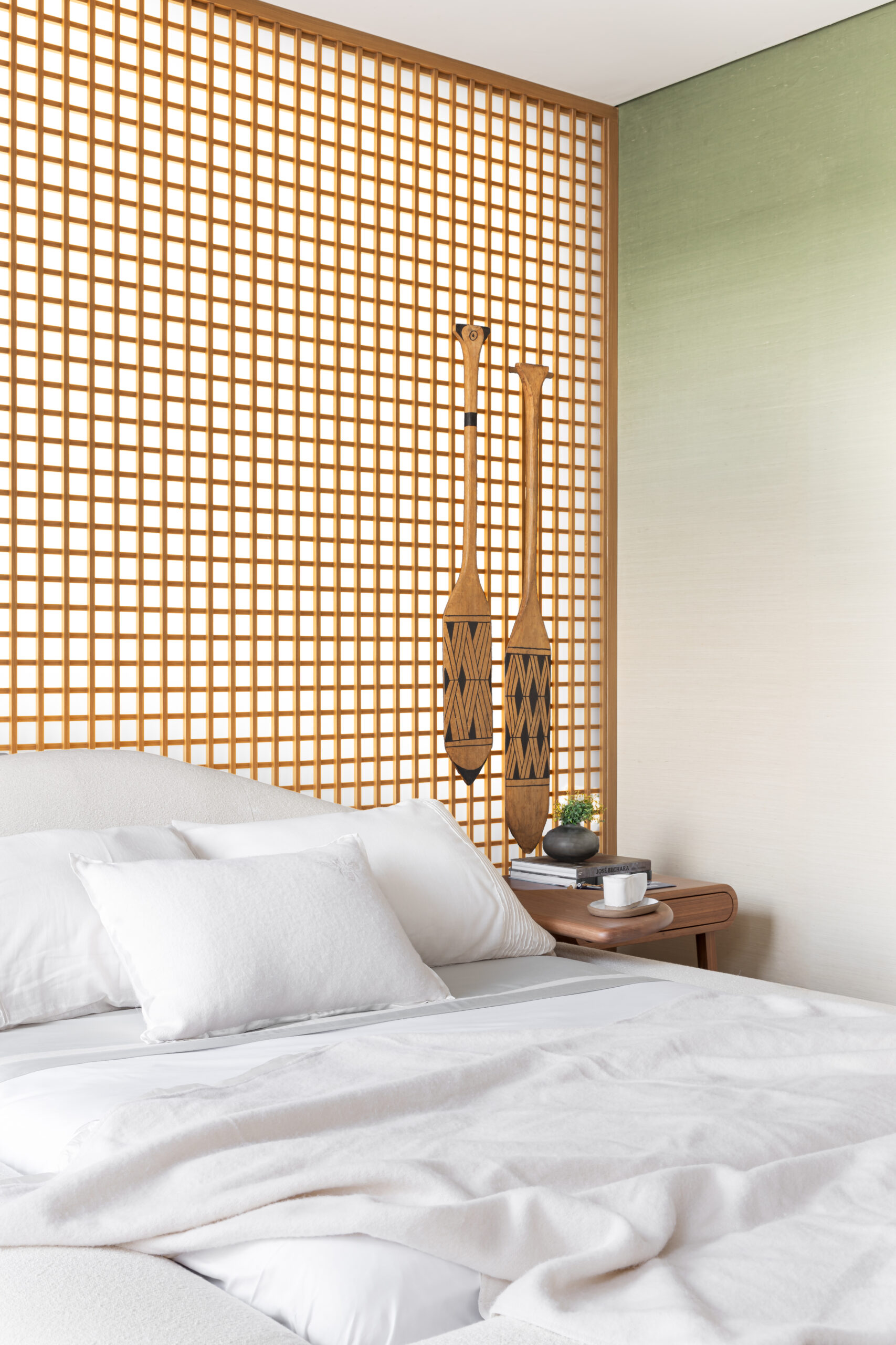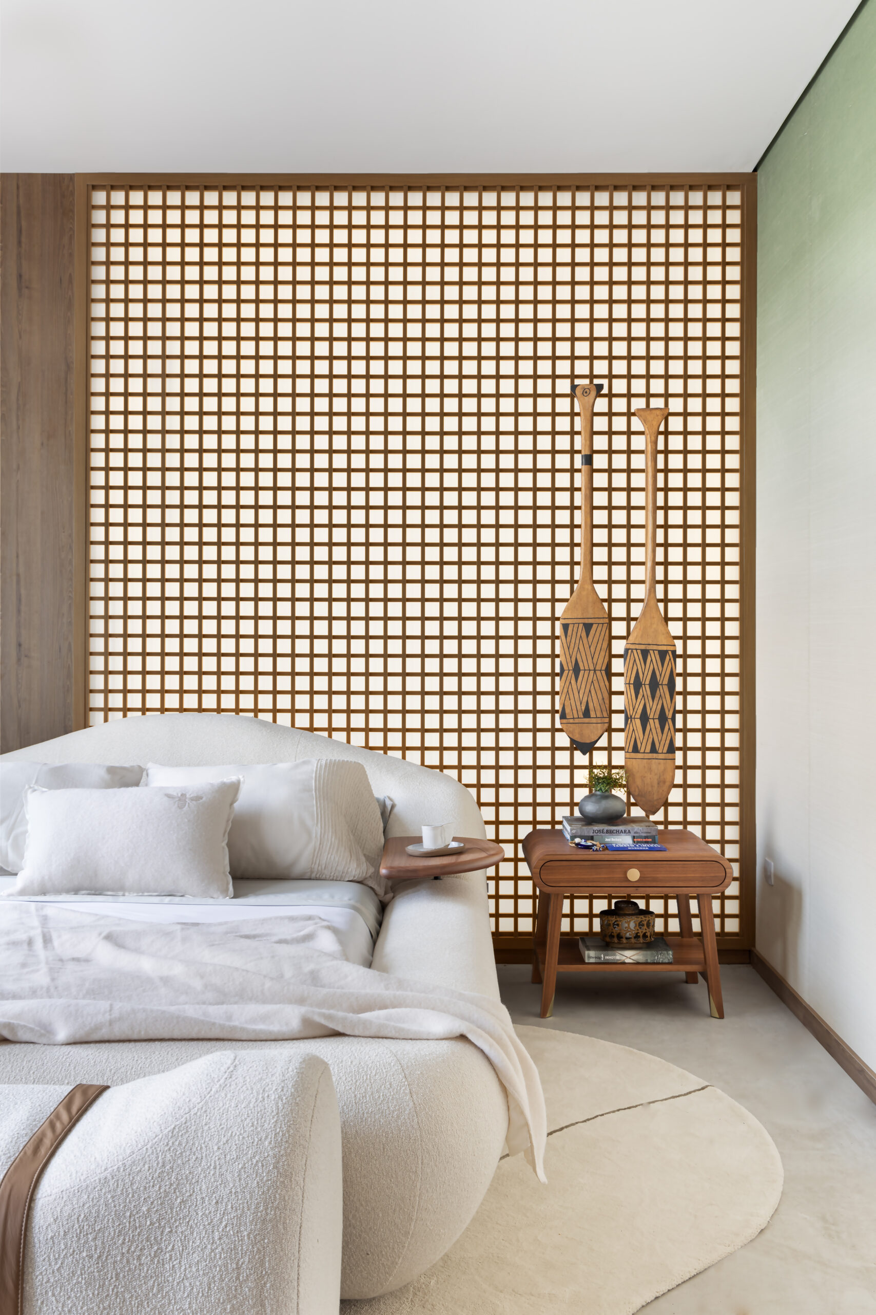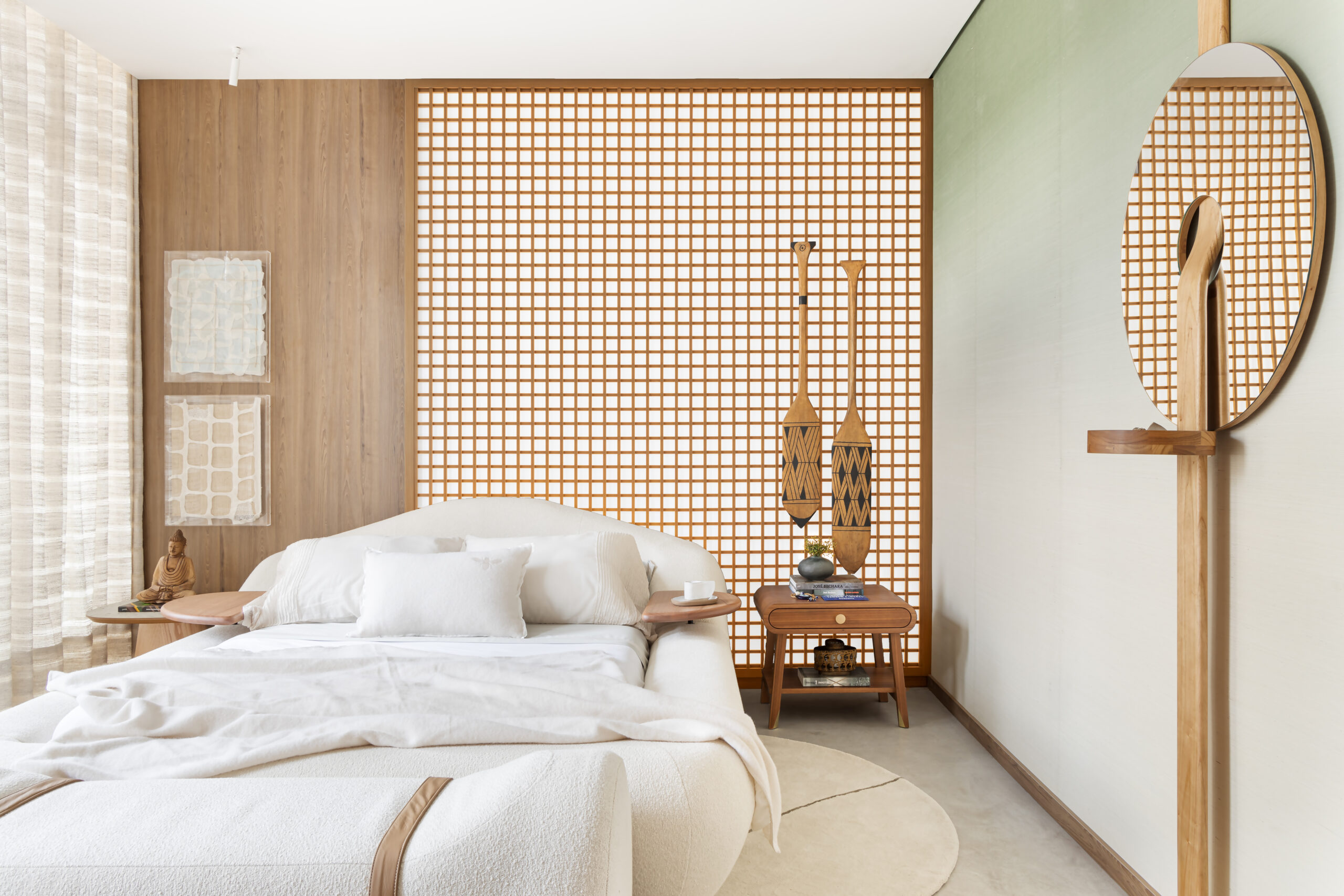 Letícia destaca ainda que a cama foi o elemento central de sua concepção para o ambiente, sendo o ponto de partida para a escolha dos demais móveis.